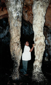 fig.2 - Lithophones occur in caves around the world, not only in Europe. Here, two resonant calcite deposits in the Mayan ritual cave of Loltun, Yucatan, are being struck.