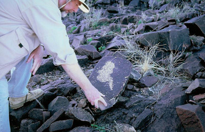 fig.4 - This rock, at an ancient vision quest site in the wilderness on the California-Mexico border, rings like tubular bells when struck with a hammerstone. It is the only rock in the vicinity to be marked with a rock engraving (dated to c.500 A.D.). [This research was conducted by one of the present Landscape and Perception investigators with help from funding by the A.H.R.C.]
