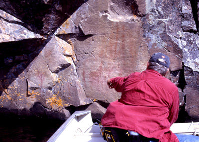 fig.6 - A researcher points out a rock art panel on Mazinaw Rock. The paintings can only be approached by boat — except in winter if ice on the lake is thick enough. [This research was conducted by one of the present Landscape and Perception investigators with help from funding by the A.H.R.C.]