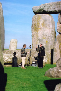 fig.7 - Keating (left) and Watson with their equipment at Stonehenge. They mapped how sound could travel through the monument, passing unhindered along certain axes but being blocked in certain other areas. In the process, they noted that the inner surfaces of some of the large upright sarsen stones had been slightly hollowed, creating concave surfaces that could “focus” the sound in certain parts of the monument.