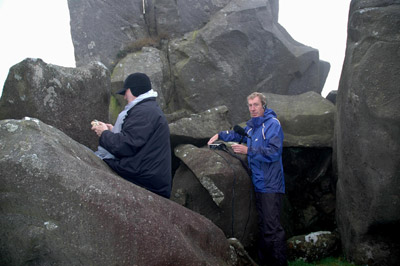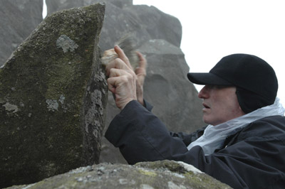 fig. 8 & 9 - After determining that there were ringing rocks, lithophones, at Carn Menyn, we invited professional percussionist, Z’EV, to “play” a few of them. The lithophones revisited and recorded with the percussionist were among those already identified and given a numbering system developed during the field study. The pictures and sound clip presented on this page relate to Z’EV’s session working on just one of them. You can think of this as original rock music! www.rhythmajik.com