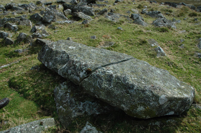 What they and their teams found early on was that the whole hilltop of Mynydd Preseli was covered with archaeology – they have now recorded approximately three hundred sites in the area now, altogether. They saw that the most distinctive bluestones, the spotted dolerites, outcrop best in the central area of Carn Menyn which had some sort of structure defining it and enclosing it. All around that area they found pillars which had been detached from the outcrops yet abandoned for various reasons – some of them broken.