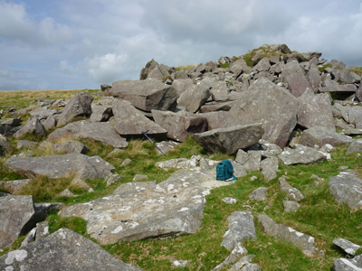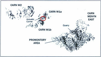 In addition to the north-east corner of the promontory, another lithophonic “hotspot” we identified on the Carn Menyn ridge was a small area we nicknamed “Acoustic Corner”, which was a scattered jumble of rocks on the south-west corner of the outcrop we dubbed “Carn W1a”. As at the promontory, this little area also gives the impression of rock disturbance that perhaps indicates an ancient, maybe Neolithic, quarry (though this has not been archaeologically confirmed). Whatever, it has a high percentage of rocks that are lithophones providing a rich range of often delicate sounds.