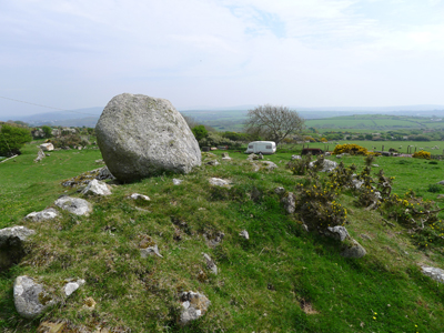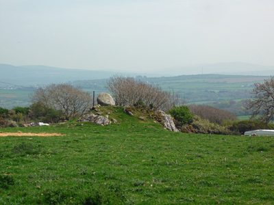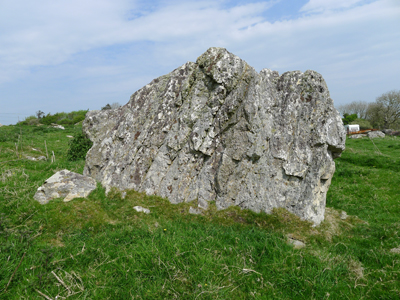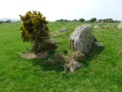 This site is collapsed dolmen known as Ffynnon Druidion, at SM918.367, south of the main Strumble Head group. Percussion testing revealed no lithophonic properties in the dolmen’s remains, but an interesting sightline was noted (at extreme limits of visibility to the SSE) to Great Treffgarn Rocks near Wolf’s Castle, a dramatic landmark feature at SM957.251, also involved in significant sightlines at Garn Turne and a related dolmen. The distance between Ffynnon Druidion dolmen and the rocks is 12.5 km. Carn Menyn at 21 km distance would almost certainly be visible on the skyline from Ffynnon Druidion in clear atmospheric conditions, but on the occasion of our visit distant haze made it impossible to visually confirm this.