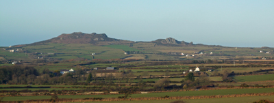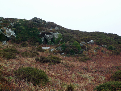 There can be no line of sight from the dolmen to Carn Menyn, as the bulk of the outcrop blocks the view, but from the top of the garn itself, Mynydd Preseli is probably visible on the skyline, judging from map cross-section, though this was not actually tested on site due to the deteriorating conditions.
