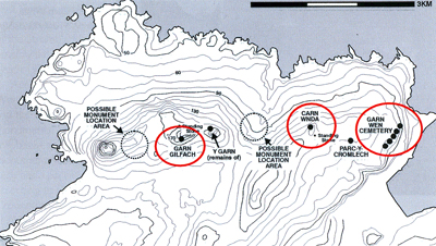 The locations of dolmens on Strumble Head (north is to the top). Some of them have all but disappeared, but the ones we targeted for visiting by the project are ringed in red – right to left (east to west): Carn Wen cemetery; Carn Wnda, and Carn Gilfach. (Map courtesy of George Nash.)