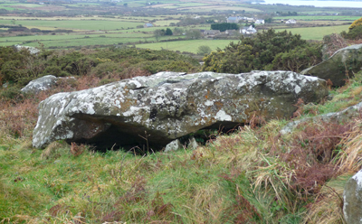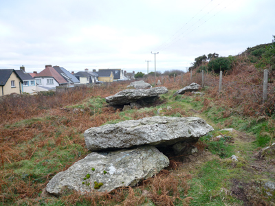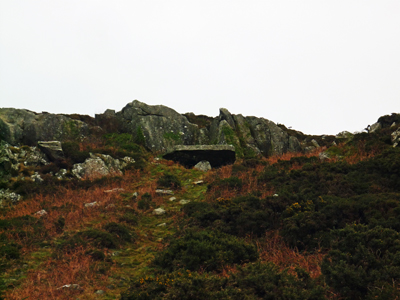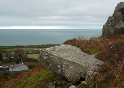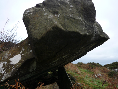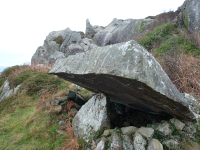 At SM933.393, on the steep NW slope of the Garn Wnda garn or outcrop. Its huge capstone is supported at the front by a triangular stone upright and at the back is wedged into the slope of the garn, immediately beneath a vertical rock face. Dolmens with part of their capstones embedded in the ground behind like this are referred to as “earth fast”. Early archaeological investigation of this site found a few burnt bones in a crude ceramic urn.