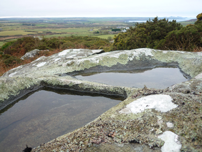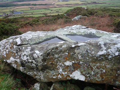 Close-up of the two (here rain-filled) depressions in Carn Gilfach’s capstone